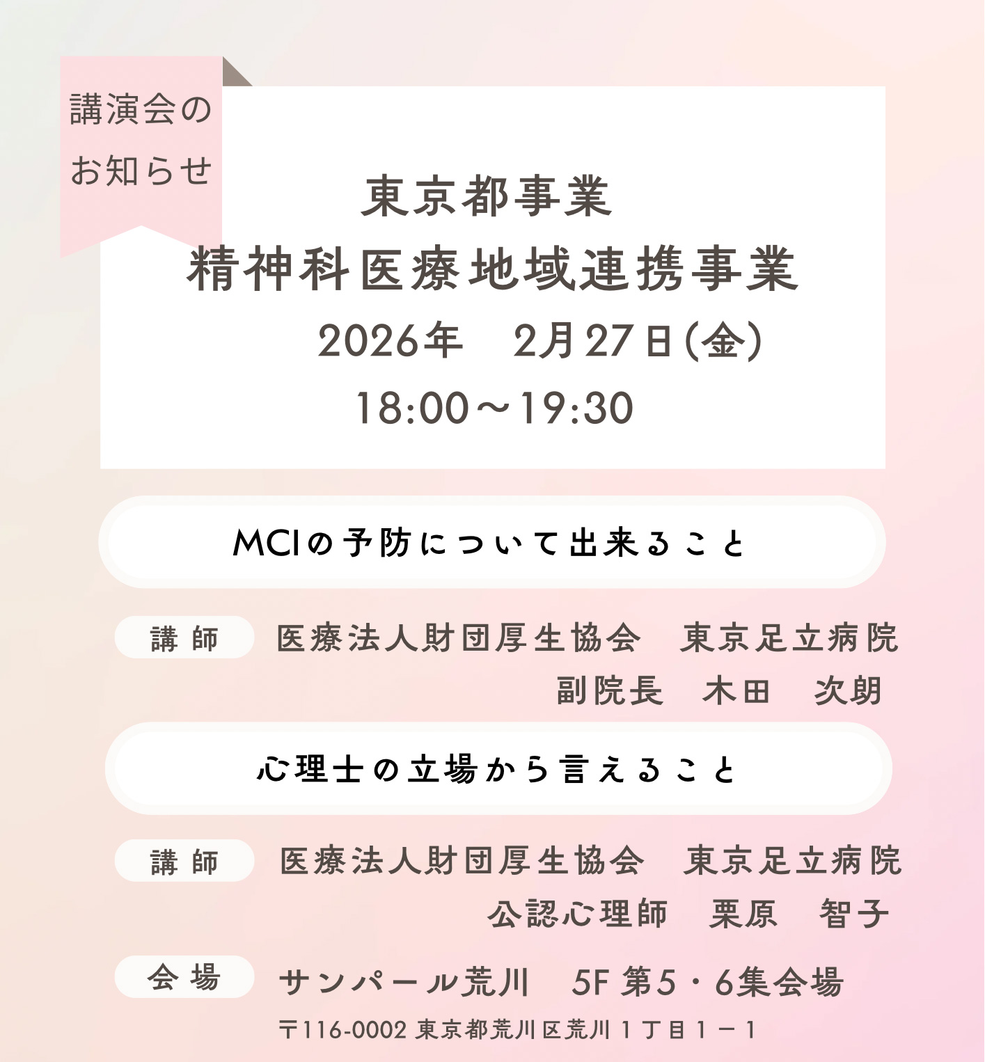 東京都事業 精神科医療地域連携事業 2026年 2月27日(金)18:00~19:00